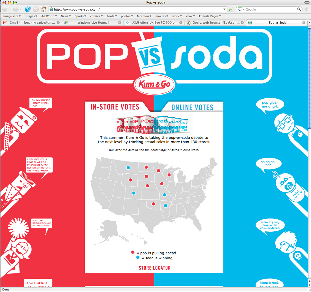 Even simple promotions deserve fun ideas. This project turned a c-store fountain-drink promotion into a referendum on American culture: do you call it ‘pop’ or ‘soda’? Two separate cups were produced, with unique barcodes, and customer’s preferences were tracked in 13 states. We also developed a fun set of animated characters to argue their side's case. Different regions in the campaign used slightly different price points. Fountain drink sales increased 26% and overall sales inside the store increased more than 7% over the previous year. This project won Best of Show at the Des Moines Addys and a Regional Gold.